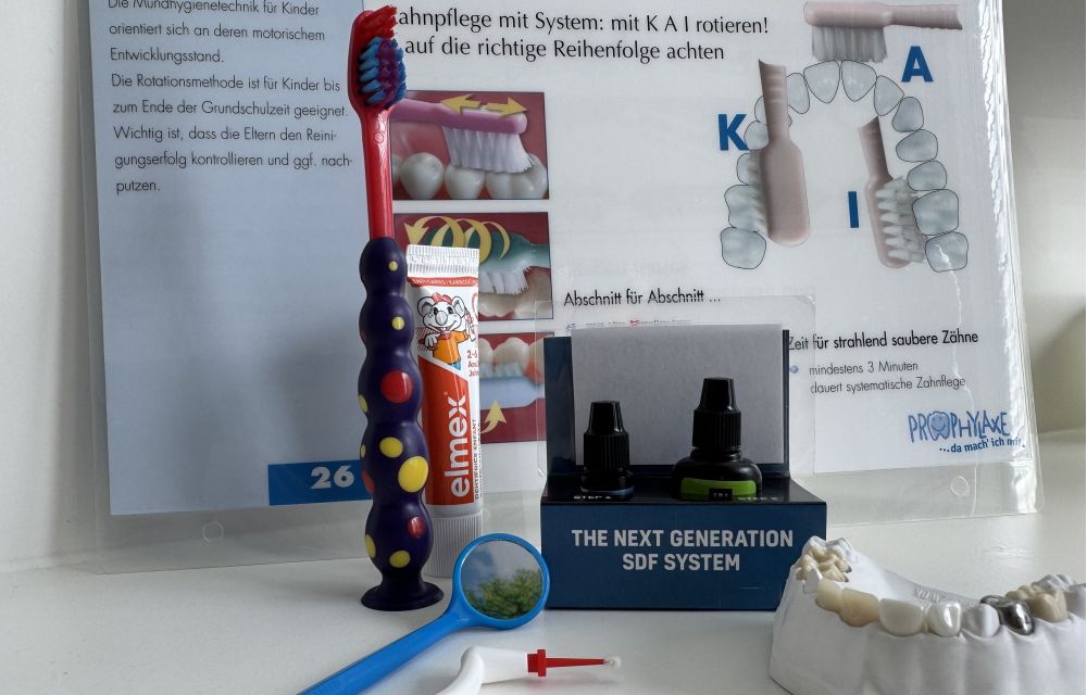 Wichtig zu wissen ist, dass die Anwendung von SDF lediglich zu einer Inaktivierung der Karies führt. Damit lässt sich eine weitere Therapie bis zum natürlichen Zahnwechsel oder einer gestiegenen Bereitschaft des Kindes herauszögern. Die mit SDF behandelten Stellen verfärben sich dauerhaft dunkelschwarz. Darunter leidet zwar die Ästhetik, die antimikrobiellen und remineralisierenden Eigenschaften von SDF machen es aber zu einem wertvollen Werkzeug in der modernen Zahnmedizin. Die Behandlung erfolgt minimalinvasiv. Im Anschluss daran ist eine gute Mundhygiene, unterstützt durch die Eltern, unbedingt notwendig. Daneben empfehlen wir den regelmäßigen Zahnarztbesuch sowie die Teilnahme an der Kinderprophylaxe ab dem sechsten Lebensjahr, welche von der gesetzlichen Krankenkasse übernommen wird.