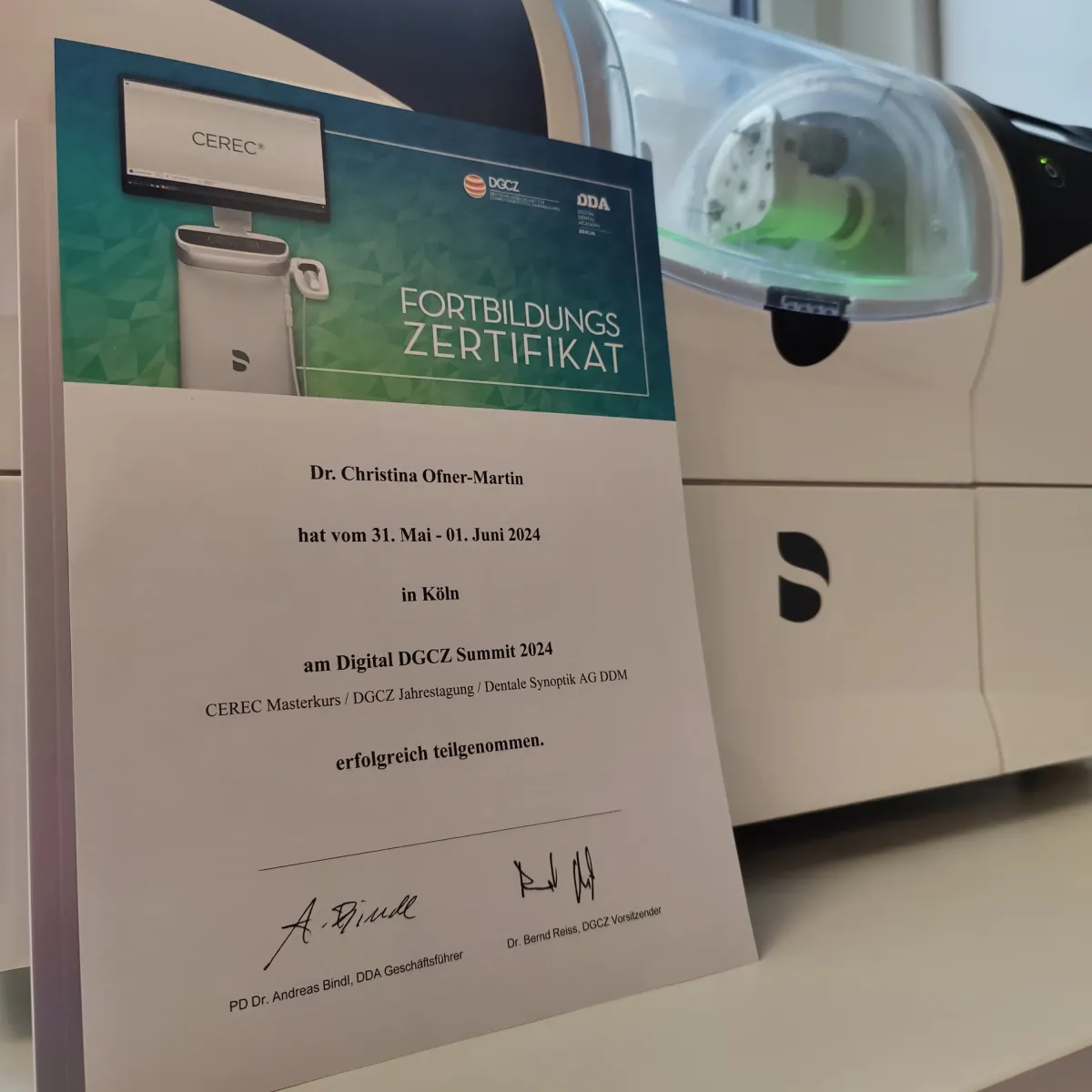 Ihre Zahngesundheit liegt uns am Herzen, daher bleiben wir stets auf dem neuesten Stand. Fr. Dr. Ofner-Martin hat kürzlich den CEREC Masterkurs erfolgreich abgeschlossen. So können Sie sicher sein, bei uns stets von höchsten Qualitätsstandards und neuesten Techniken zu profitieren.